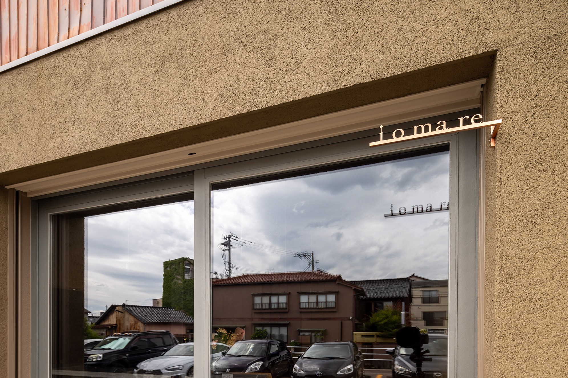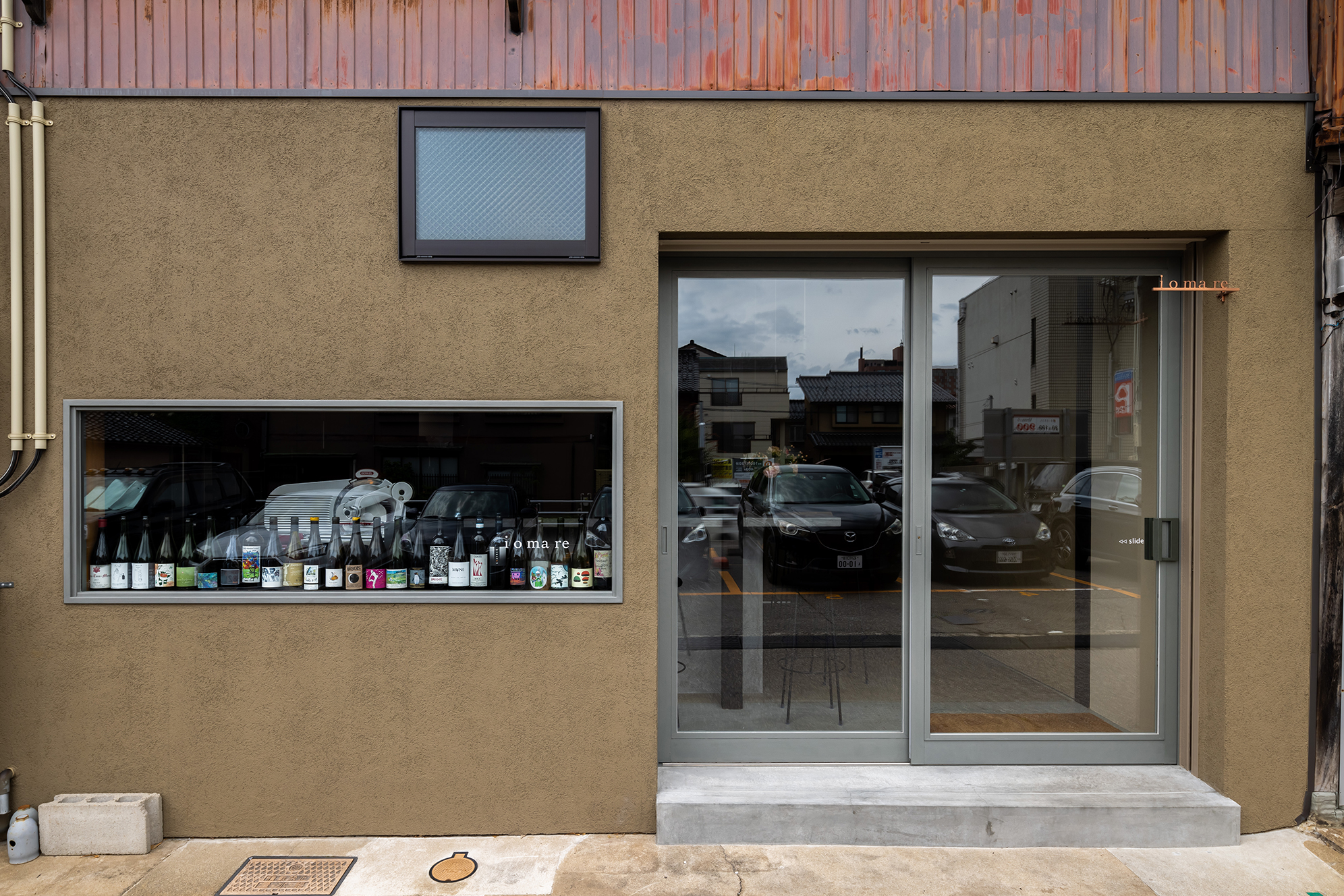 その庇に合わせて塗り替えたワインショップの壁。