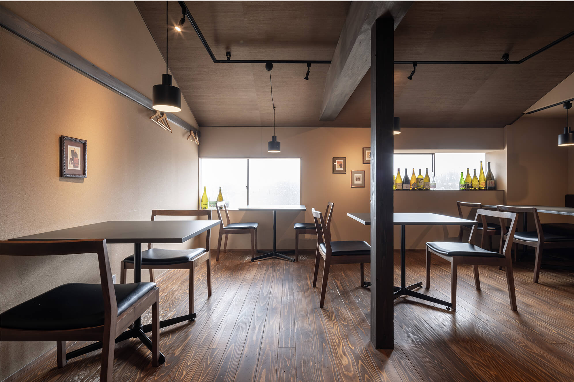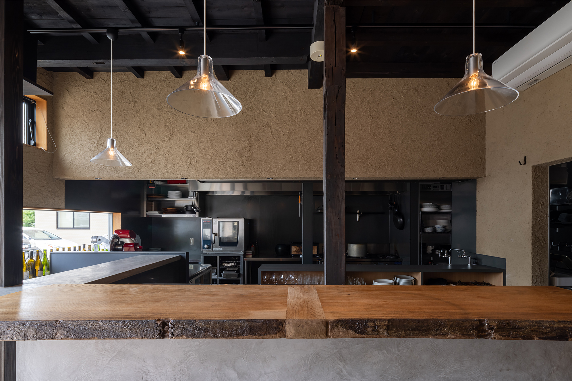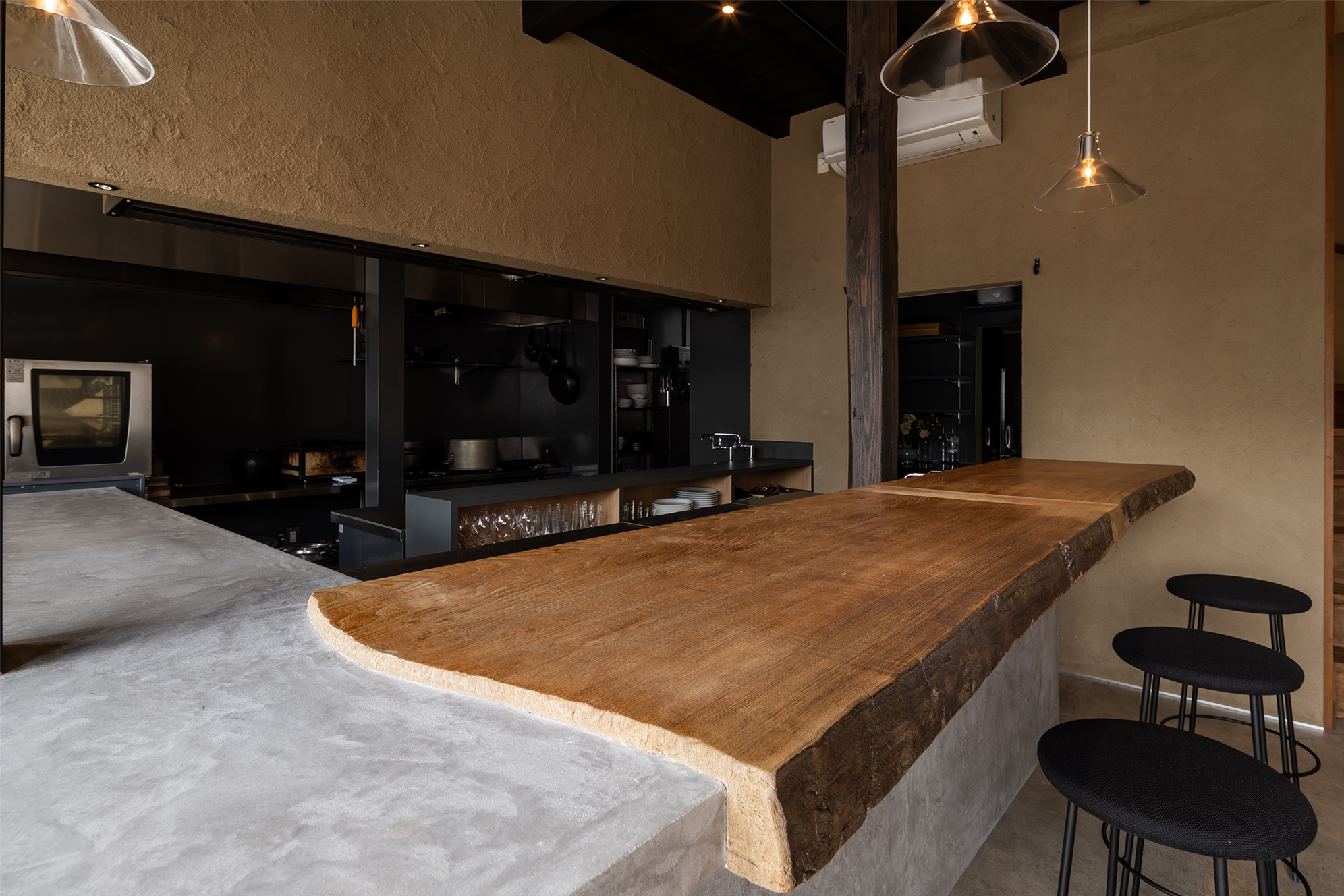テーブル席、神代楡1枚板。