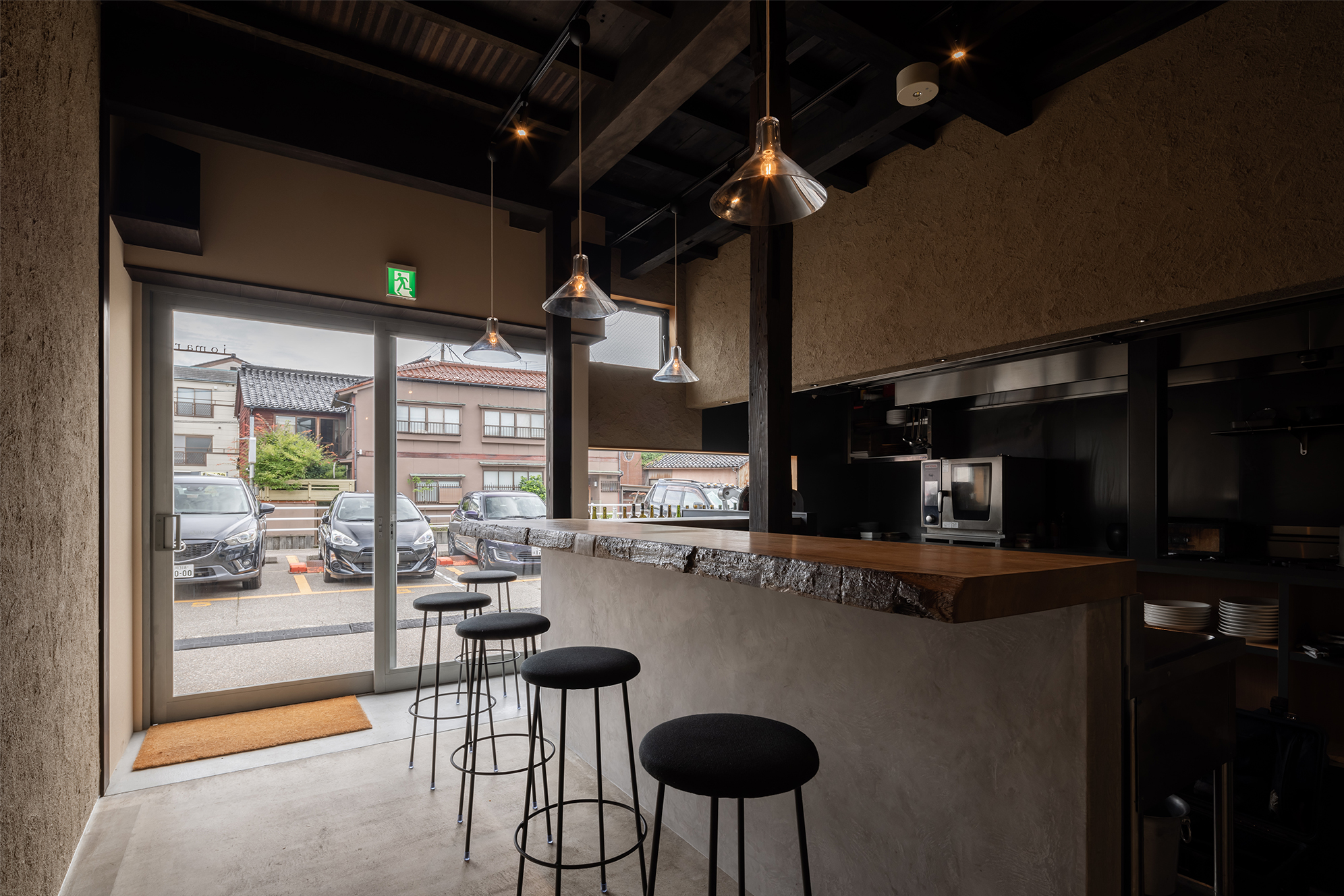 カウンター、モロッコ漆喰、生ハムのための冷蔵ショーケース埋め込み。