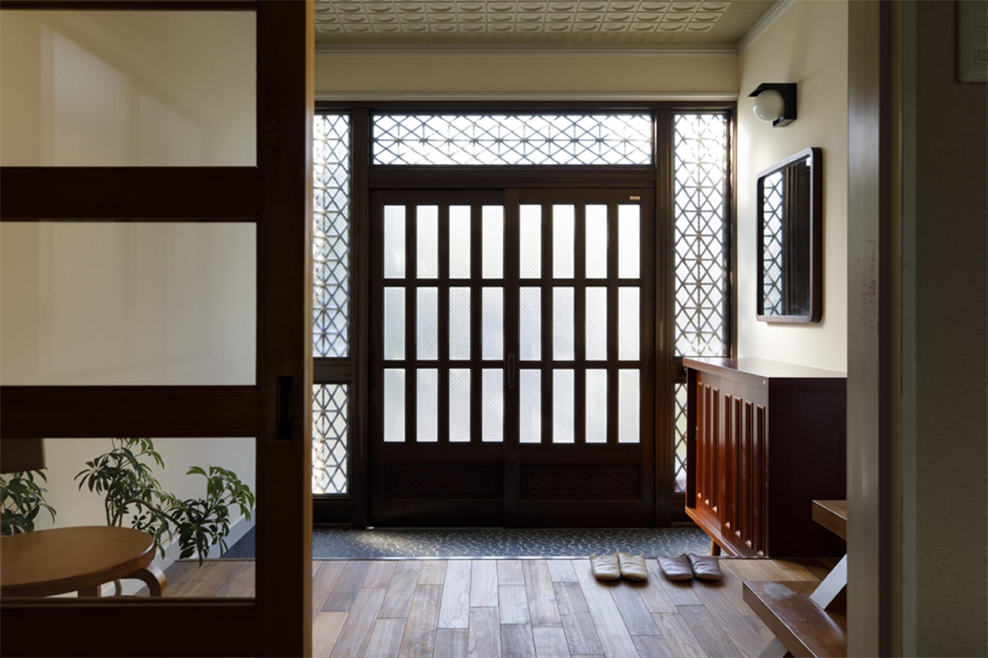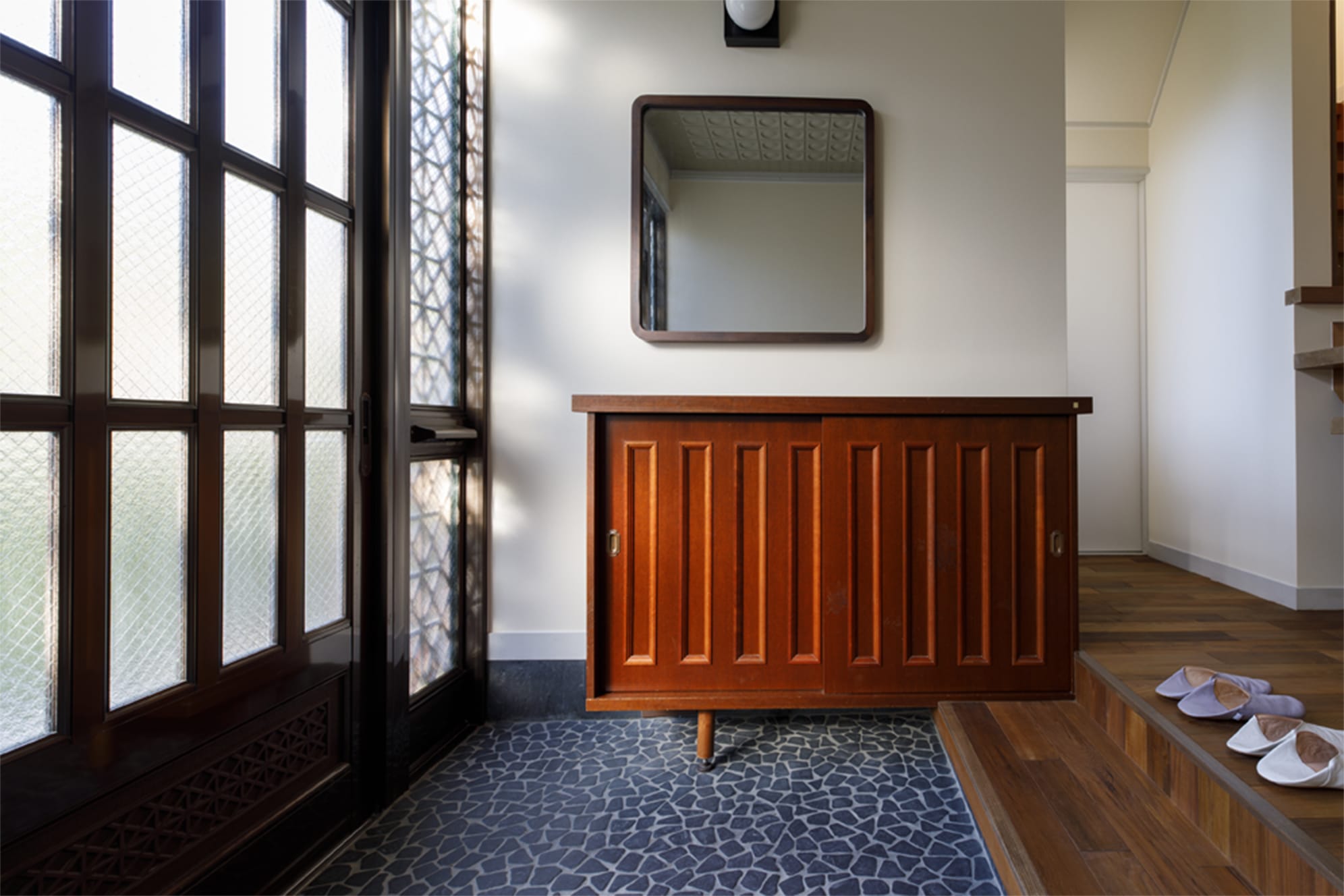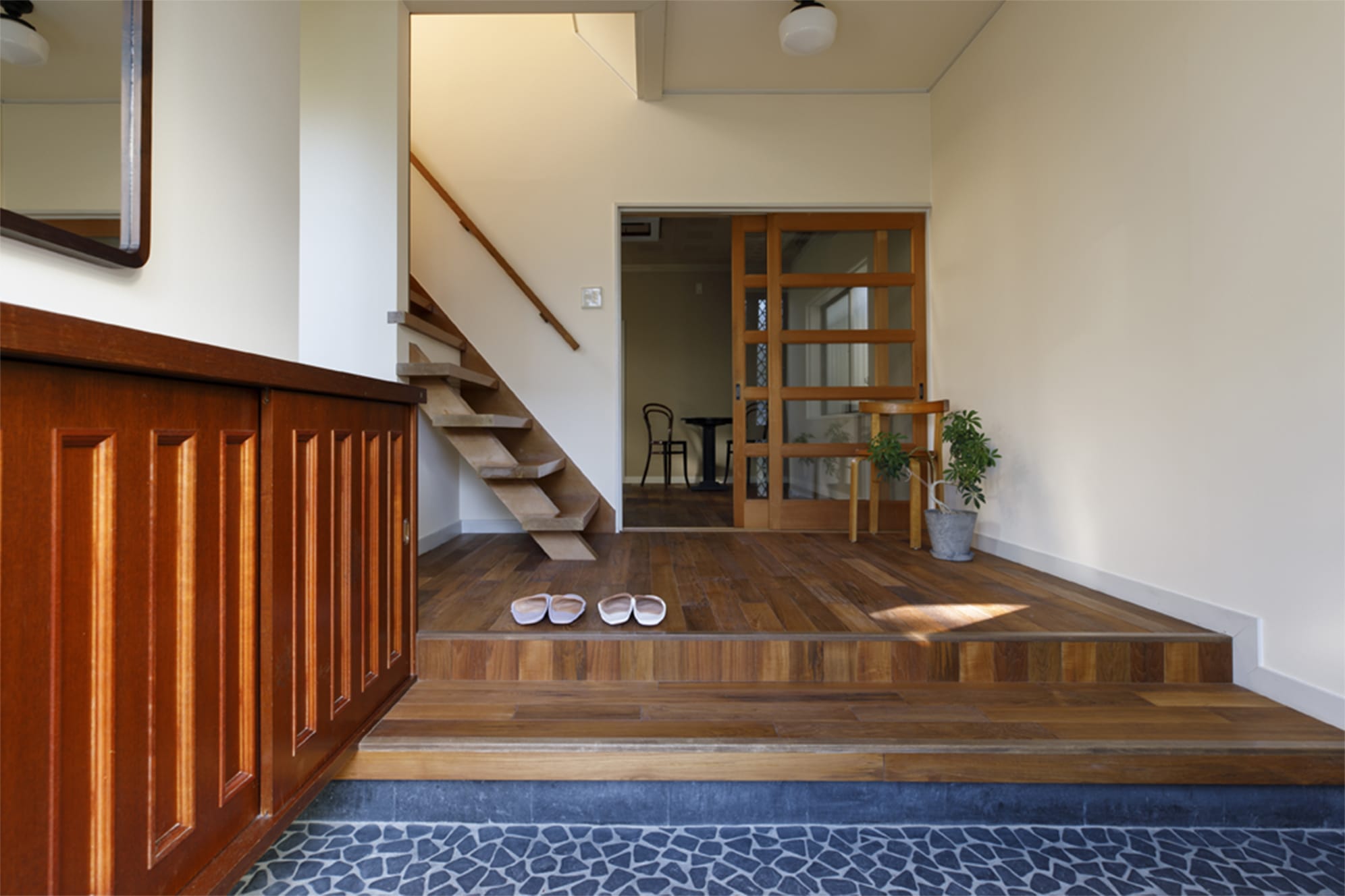 玄関土間の美しい敷き詰め石、下足棚、これらはそのまま残す。