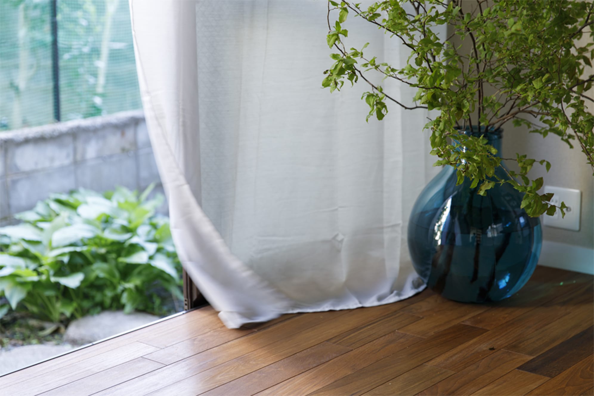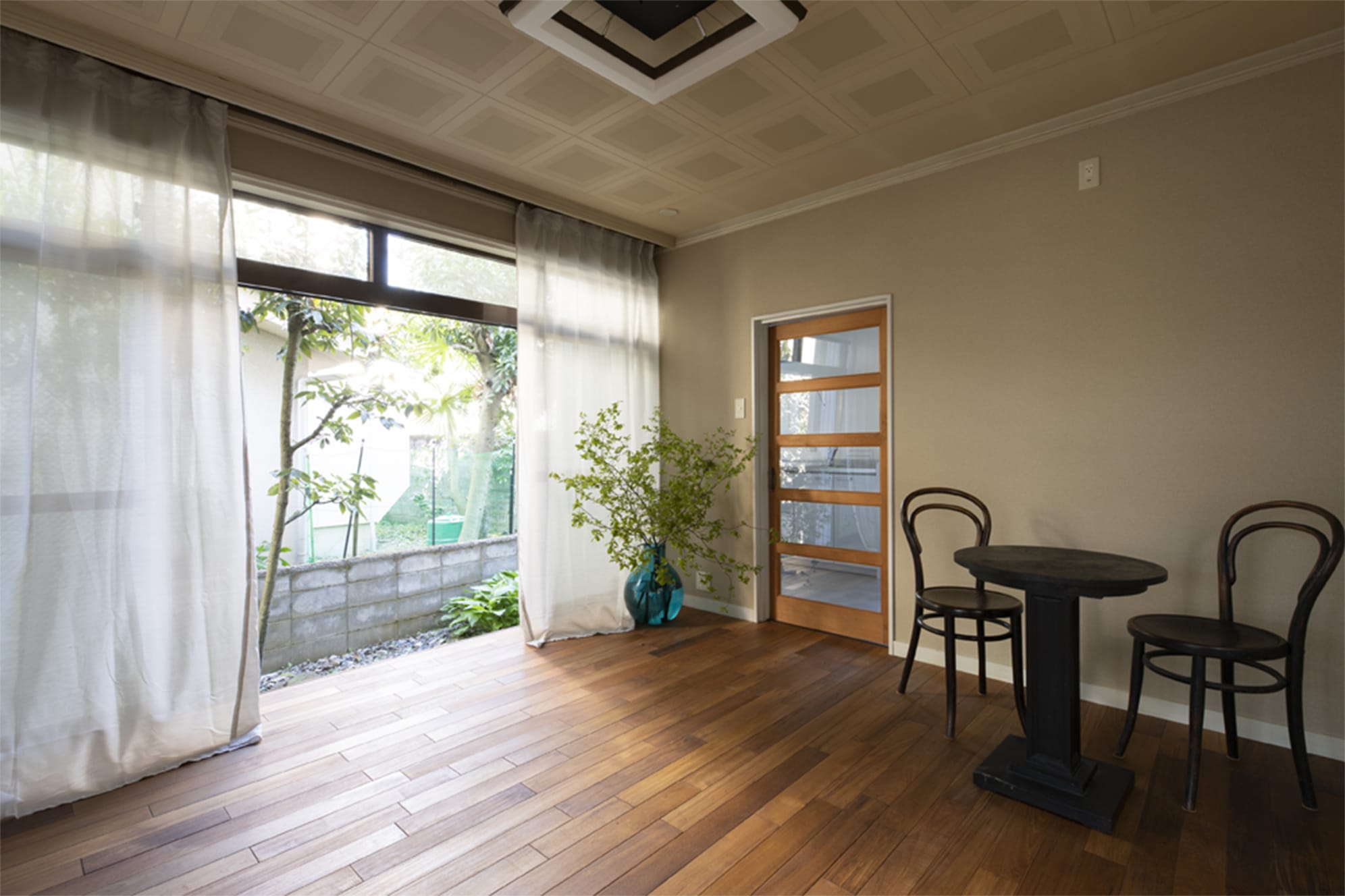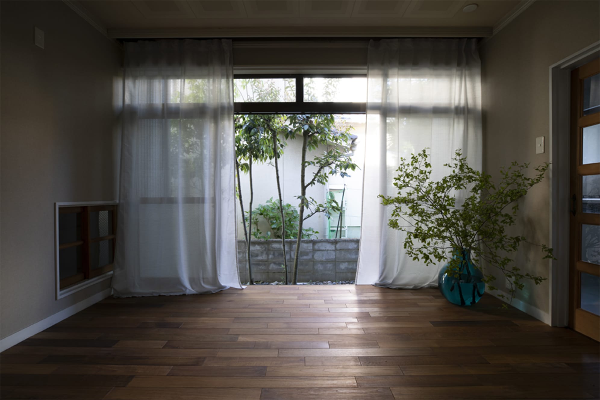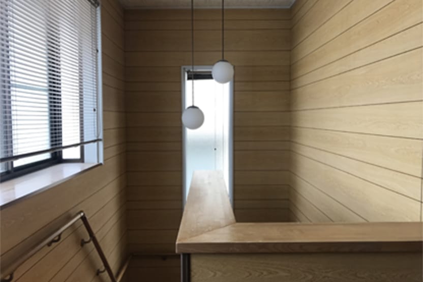 玄関ホールからリビングまで、床と壁を張り替える。無垢チークのフローリング。