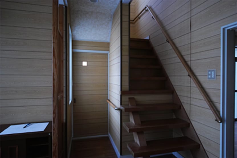 既存の階段。手摺りは造り替える。無垢チークの造作手摺り。