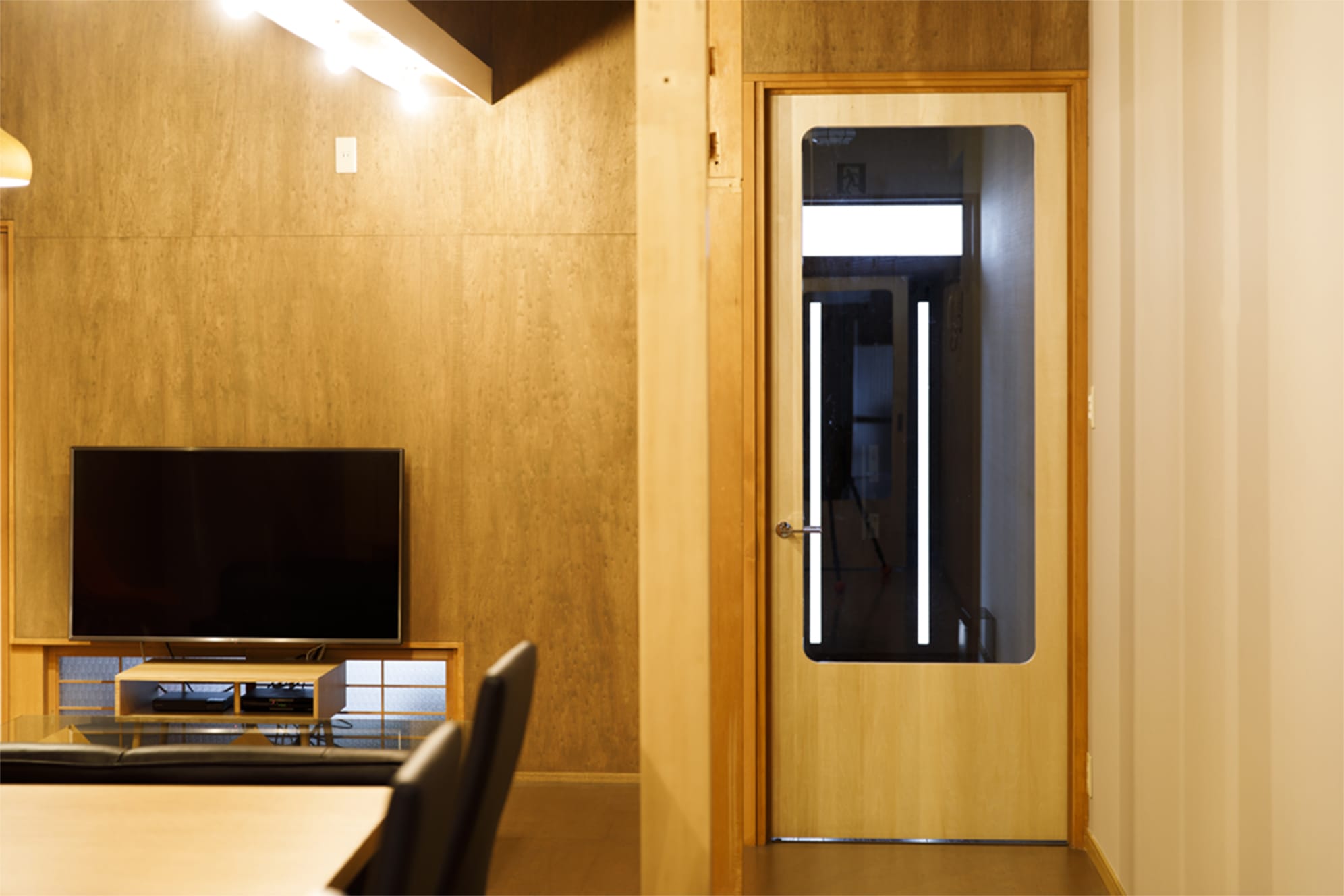 壁、ラワンベニヤオイルフィニッシュ、既存100角磁器室タイル