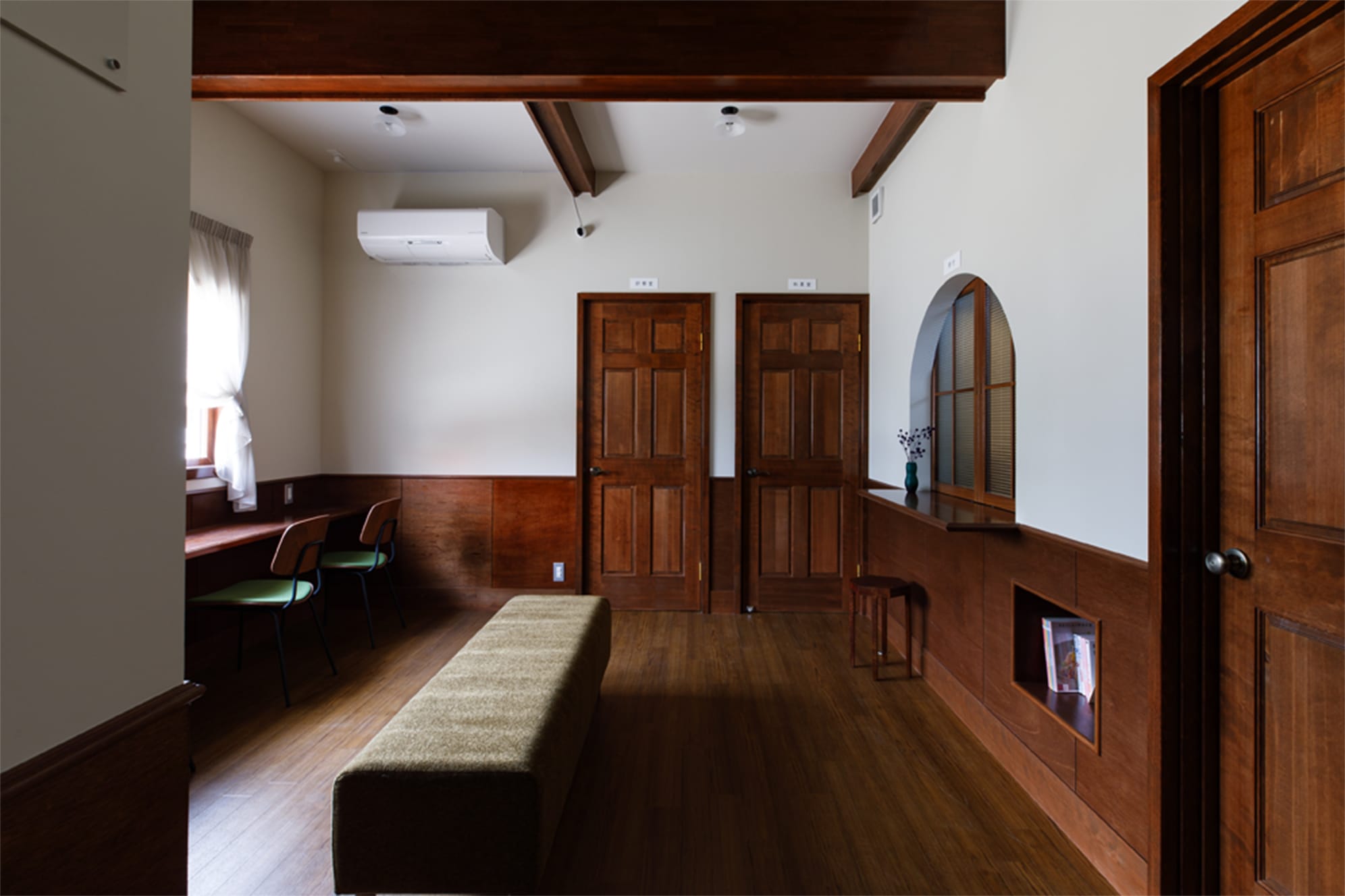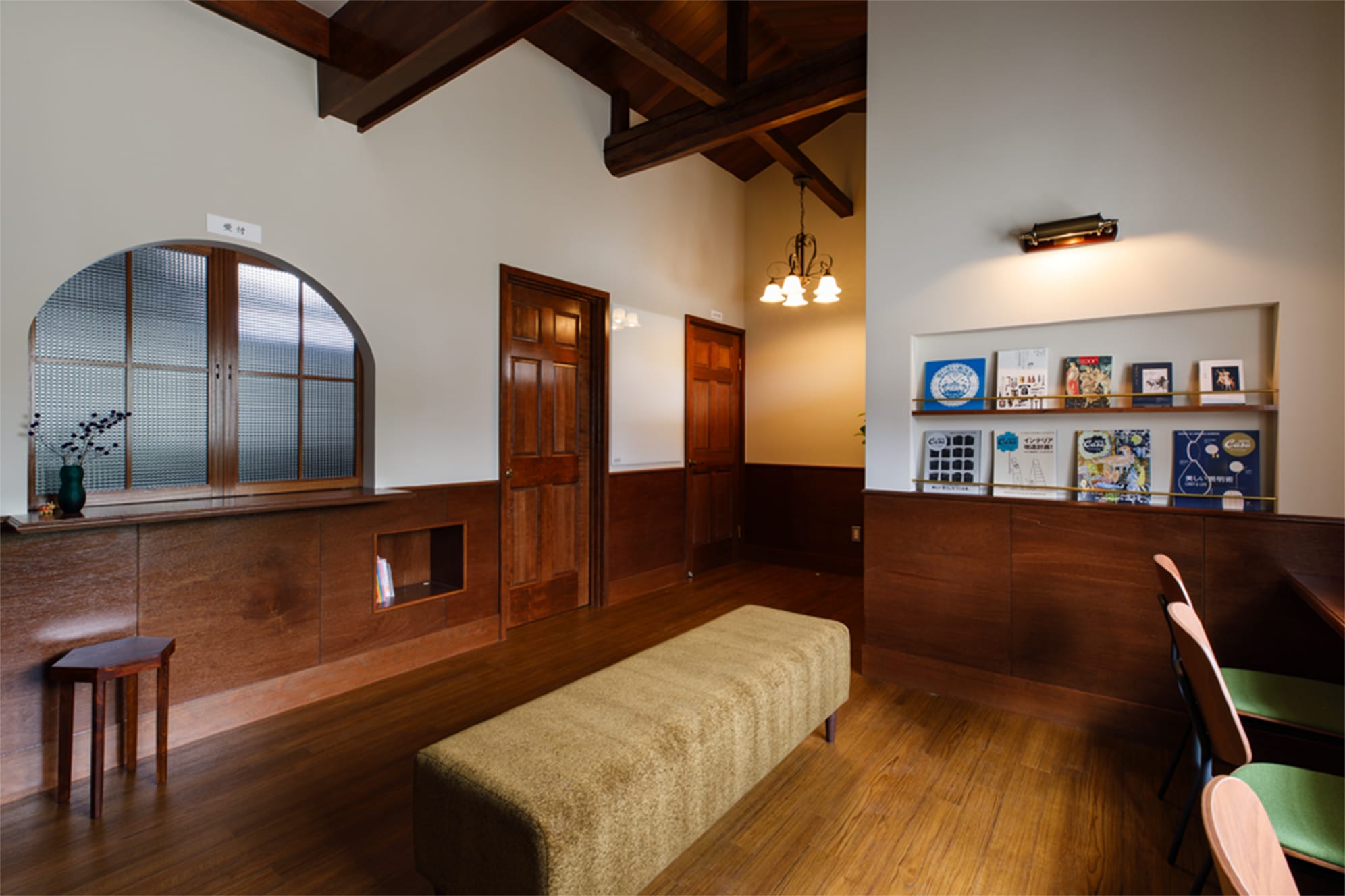 受付、アーチ状小窓、突き出しカウンター小口モールまわし。