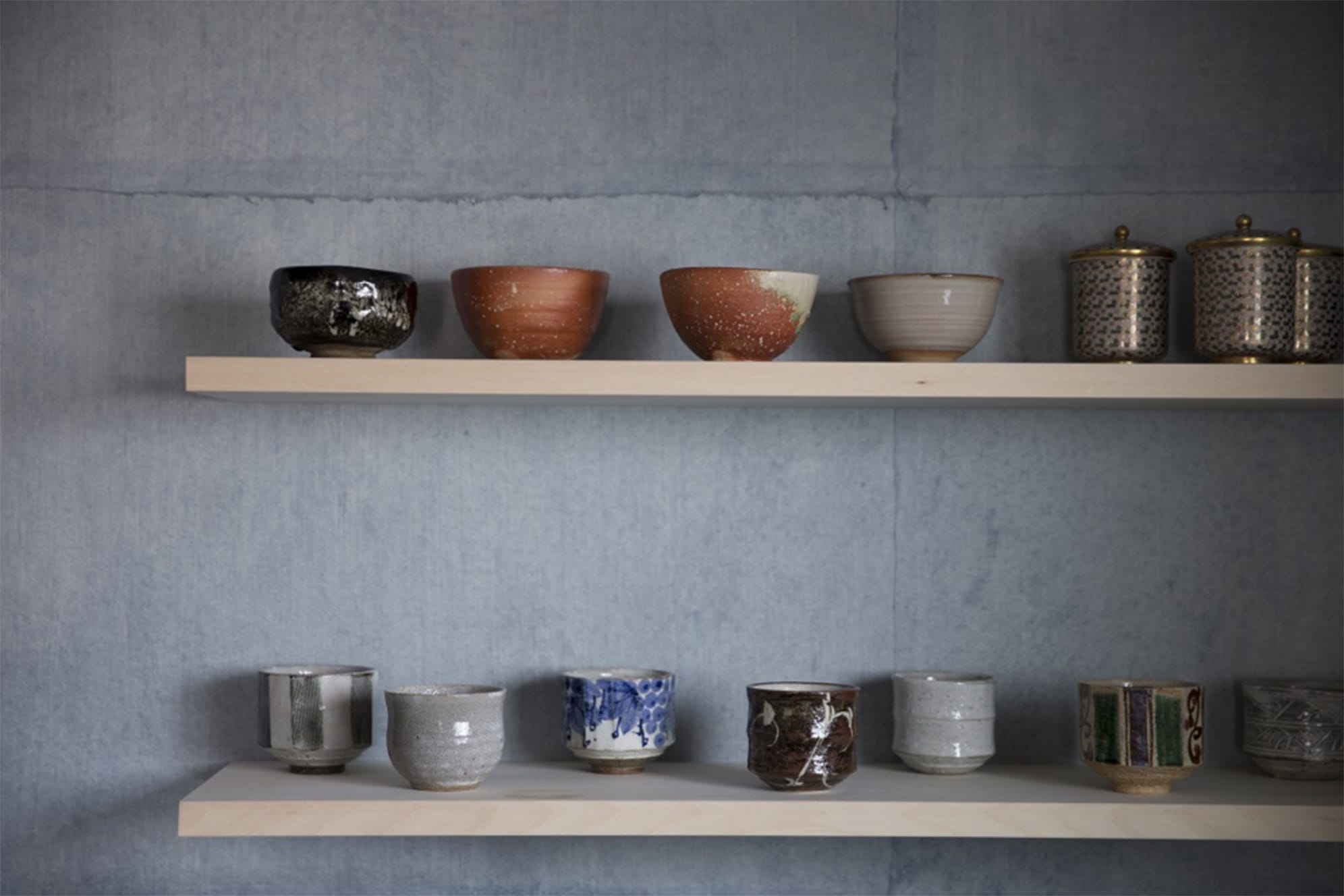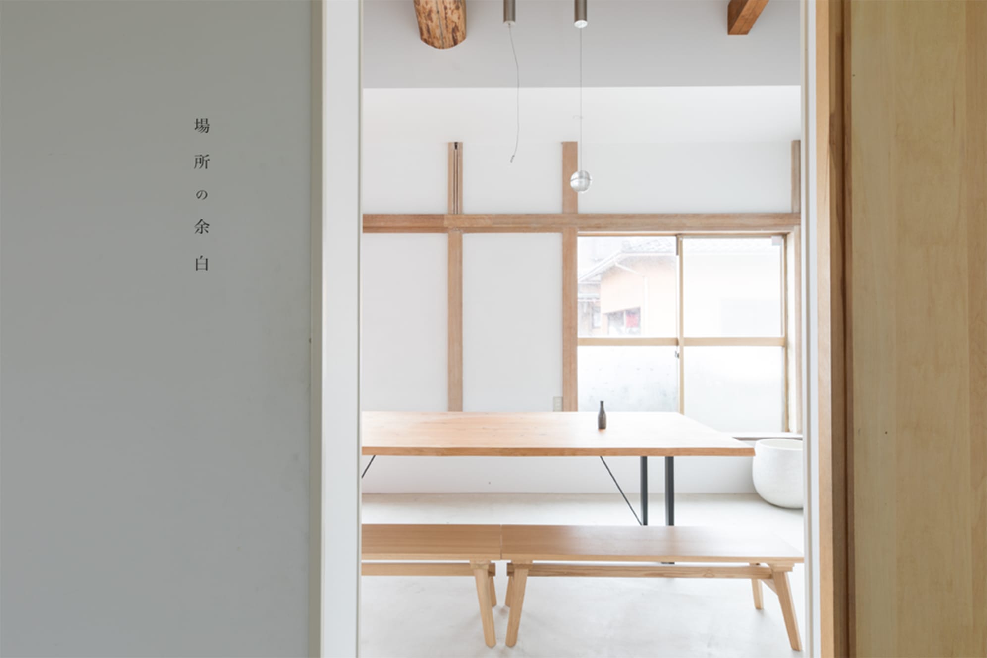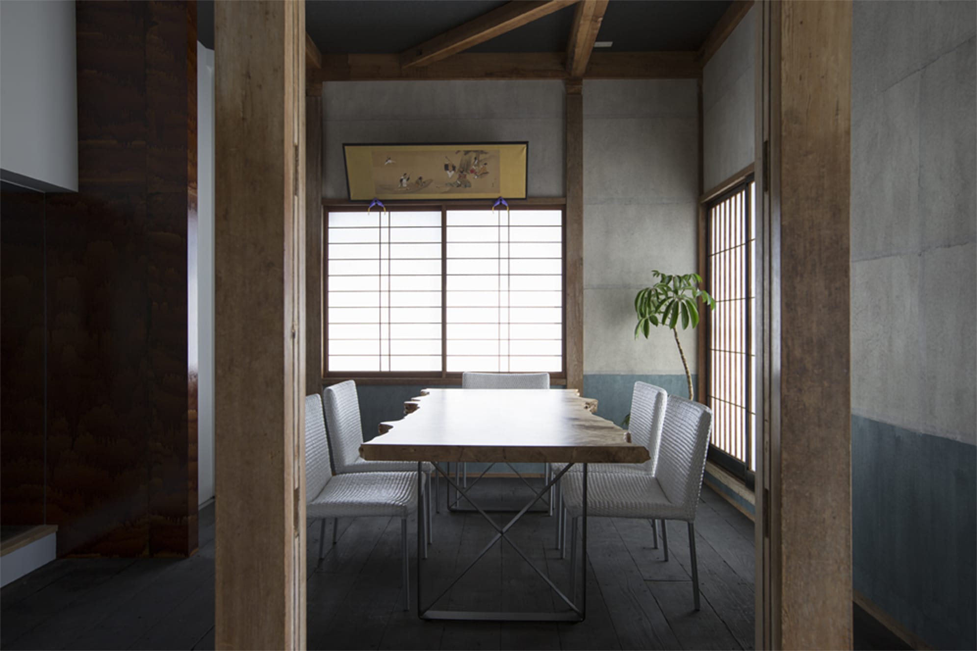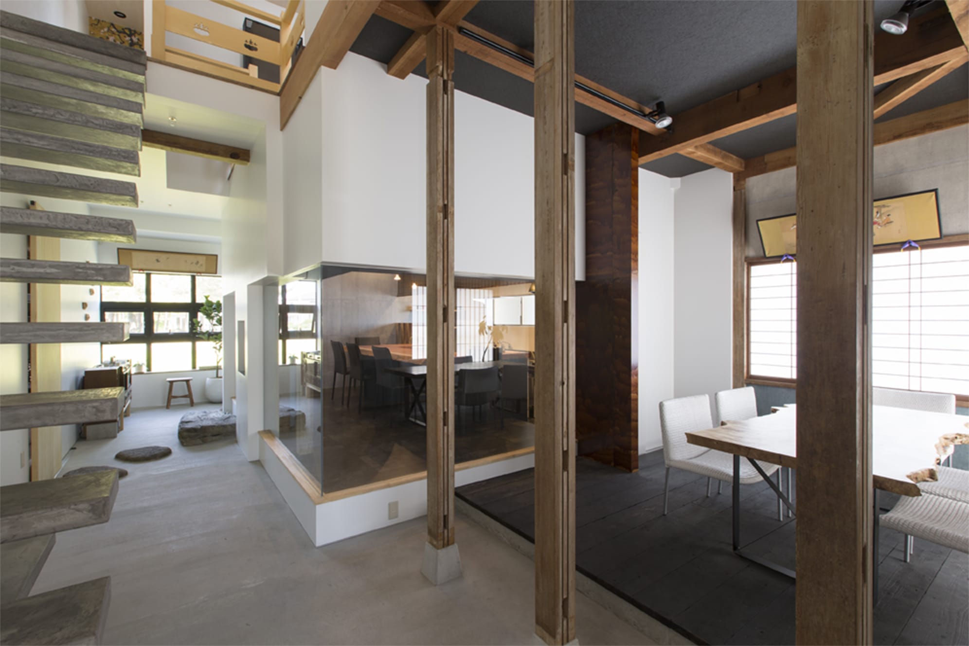段差、古材の床、無垢天板のテーブル、漆和紙の壁、ガラスの壁