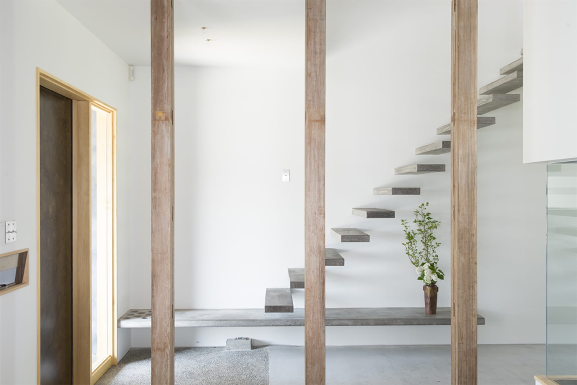 土間、左官仕上げの片持ち階段、白塗装壁、柱が3本、吹き抜け