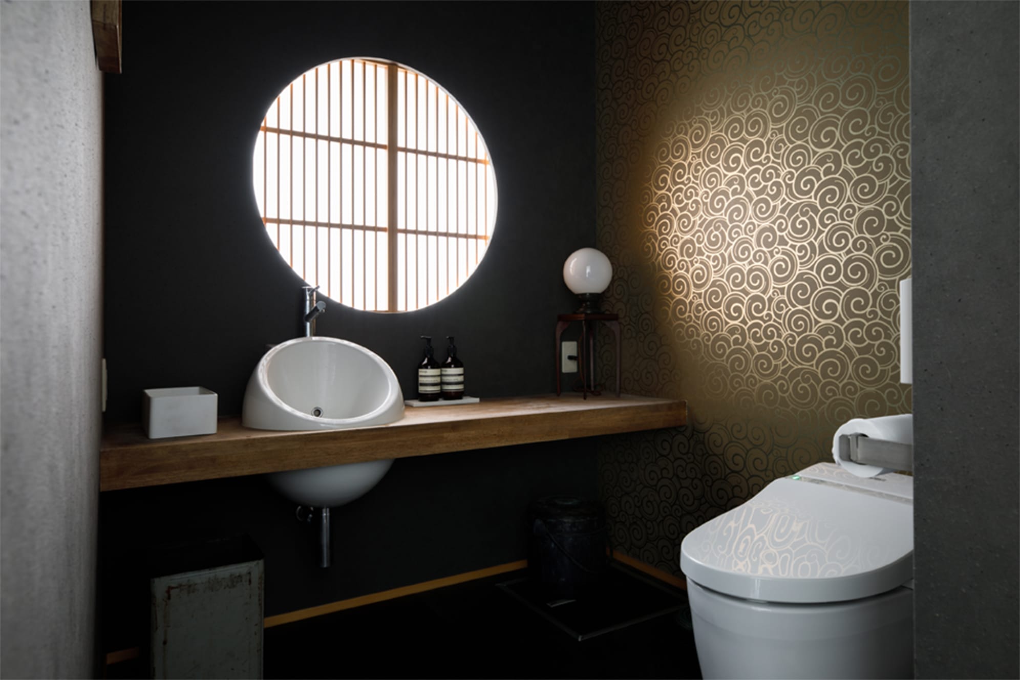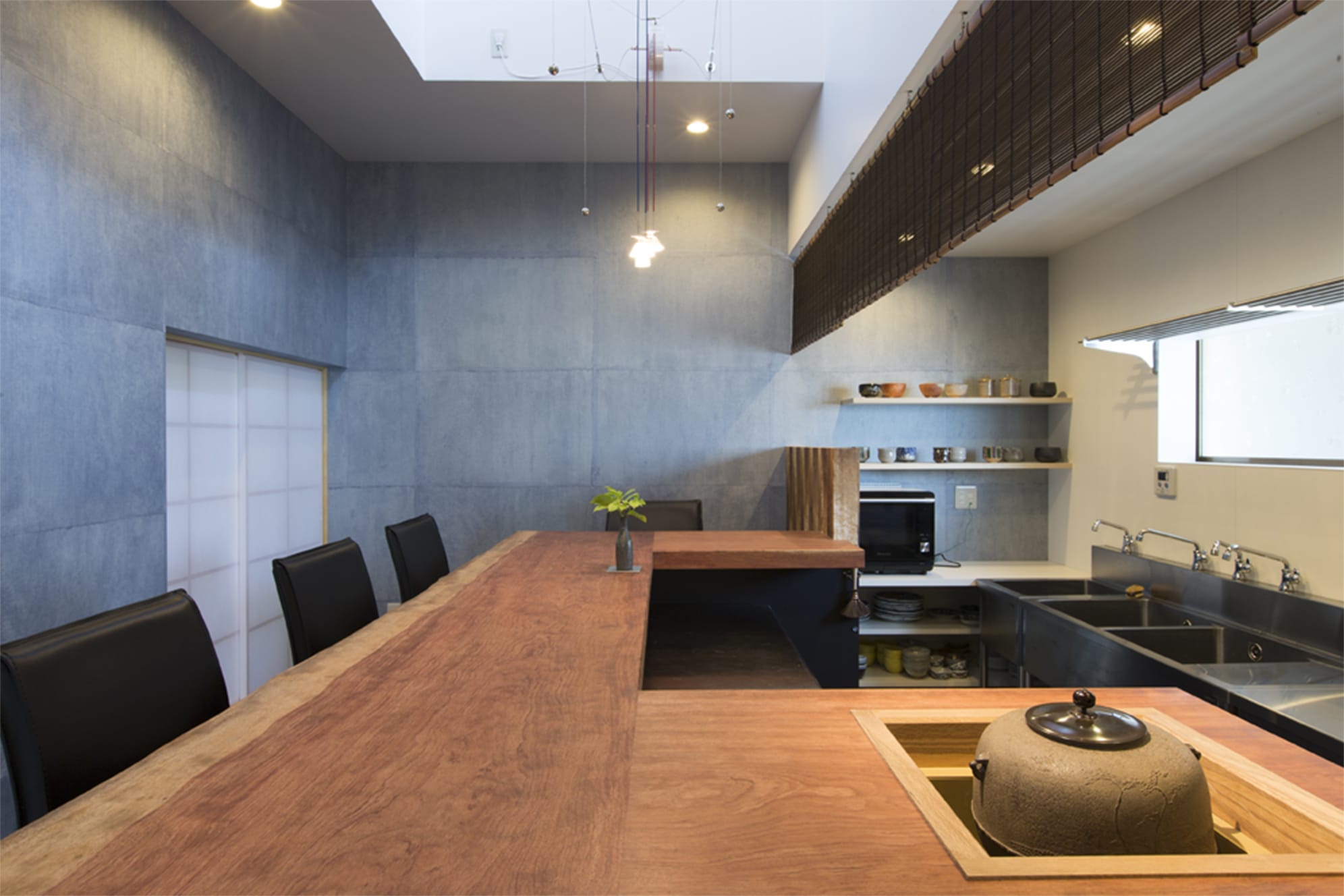 手漉き和紙貼りの壁、無垢天板のコの字型カウンター席、吊り照明、吹き抜け