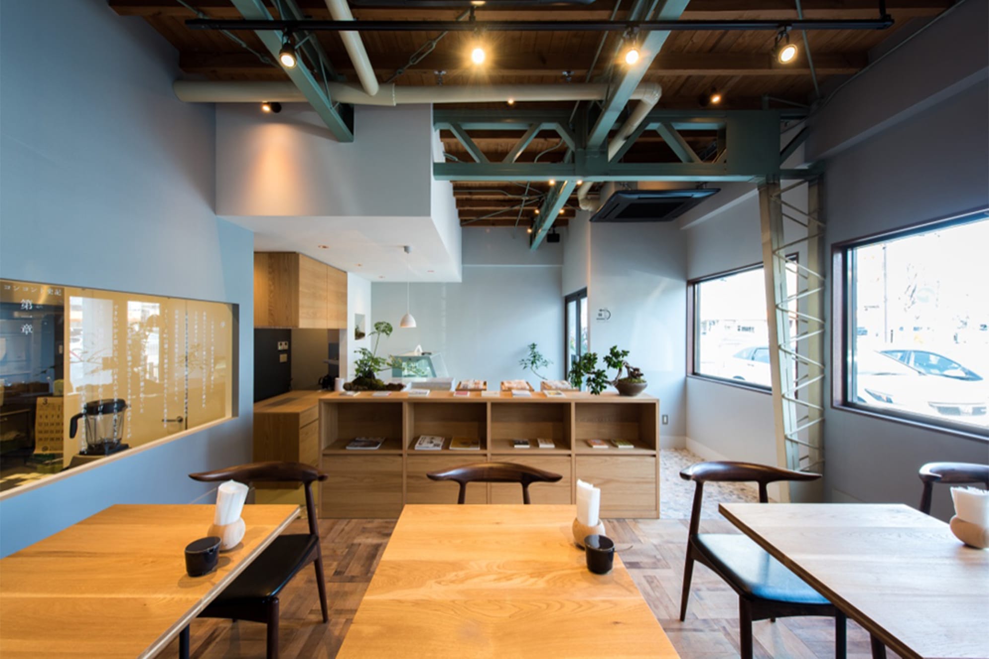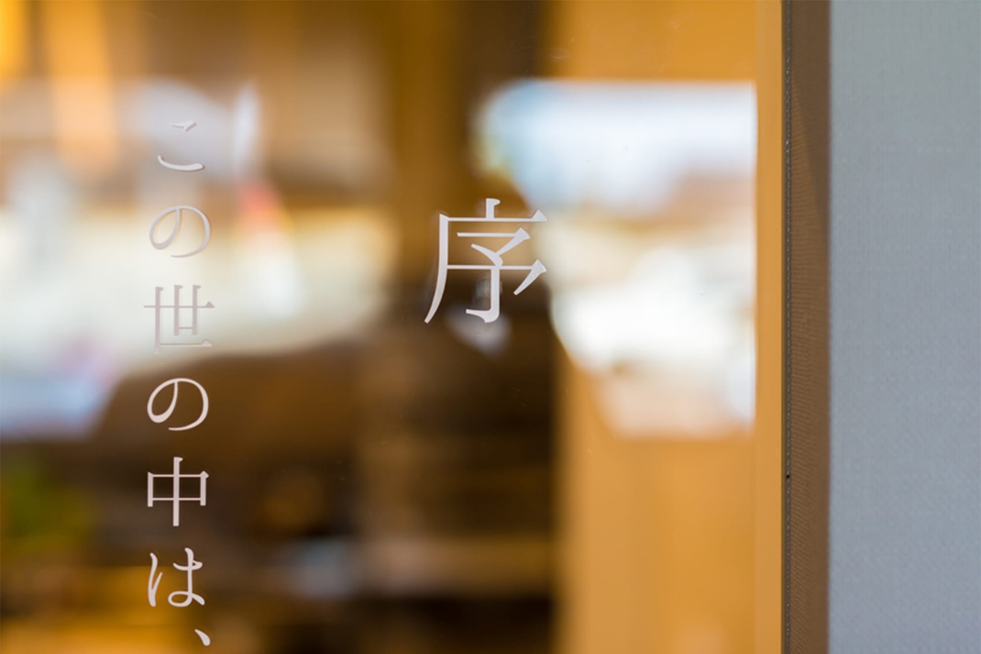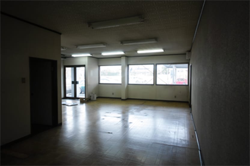 間仕切り壁、大きな横長ガラス窓。ガラス窓に白い貼り文字で店の史記。