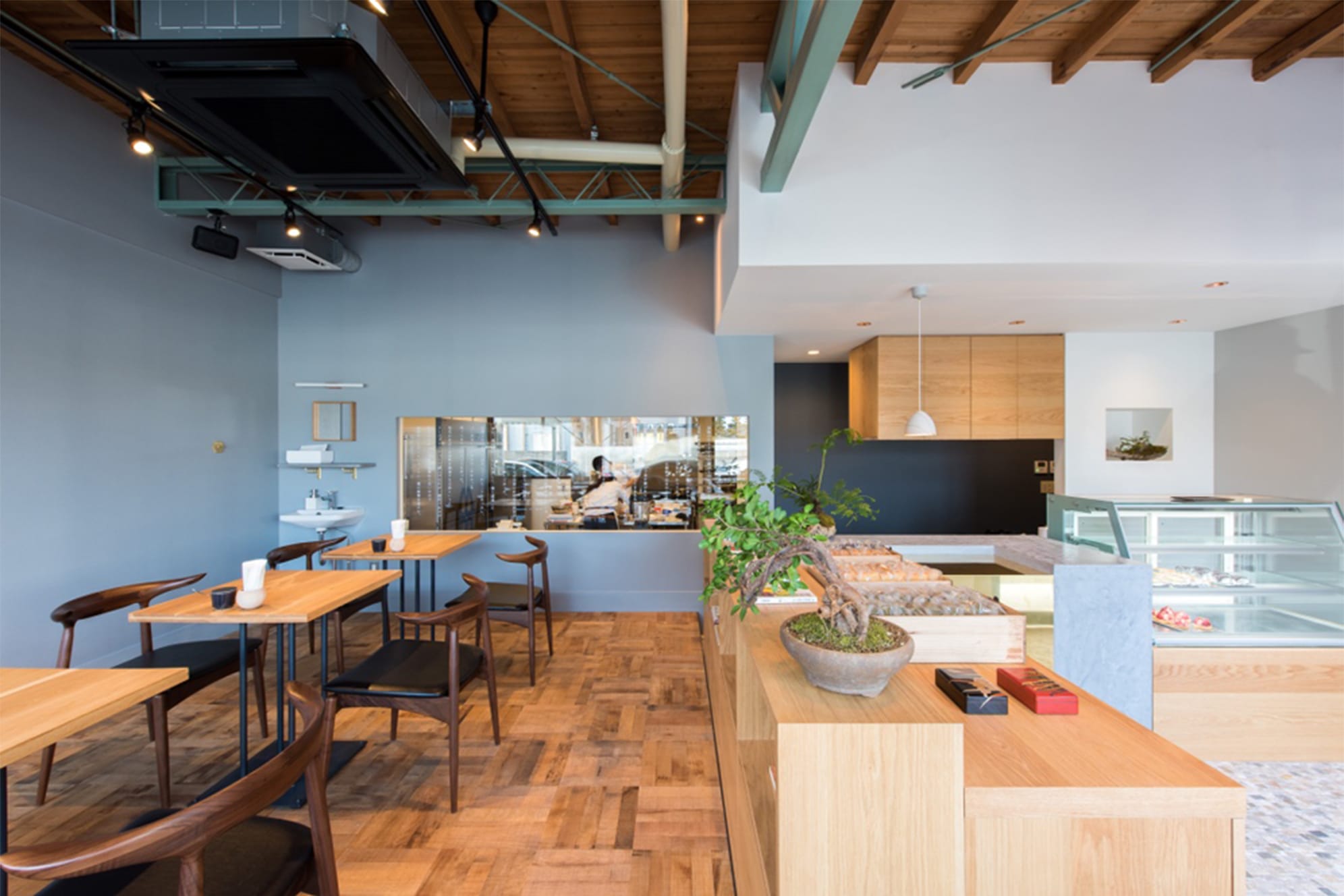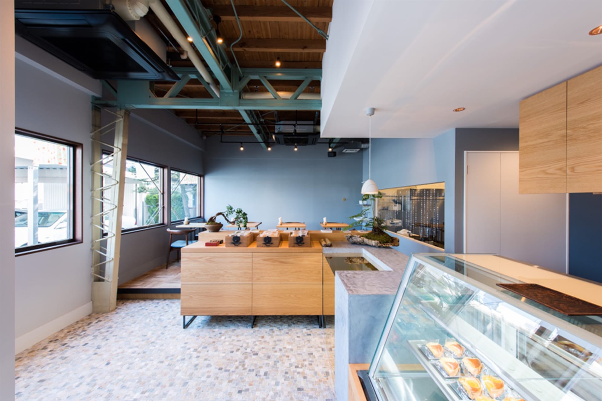 緑色に塗装された鉄骨梁。天井は杉の野地板が整然と並ぶ。