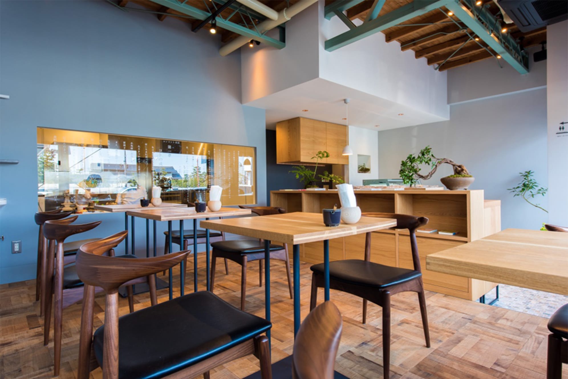 テーブルと椅子、2人掛け4組。