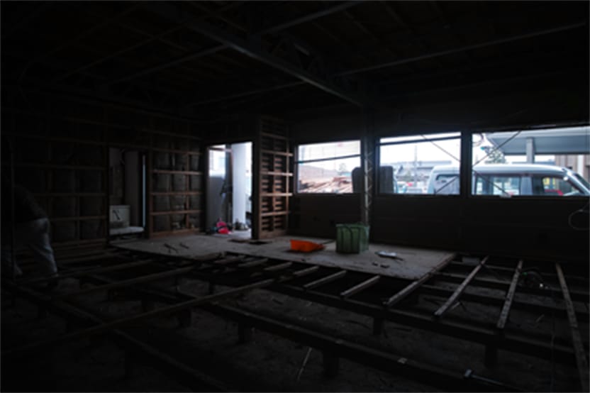 既存の鉄骨梁、緑色の塗装。